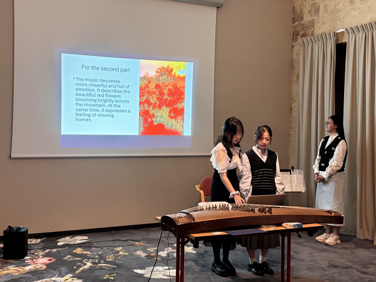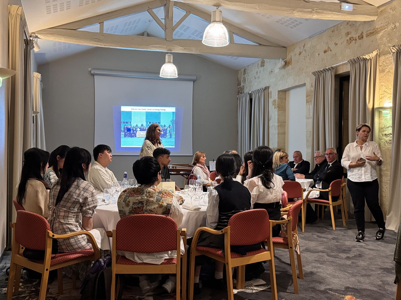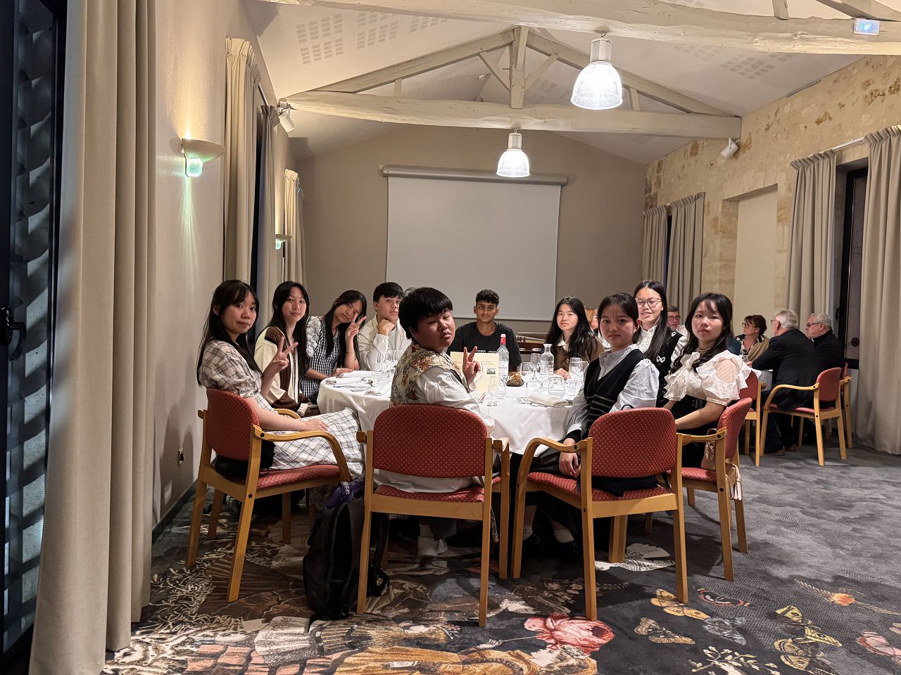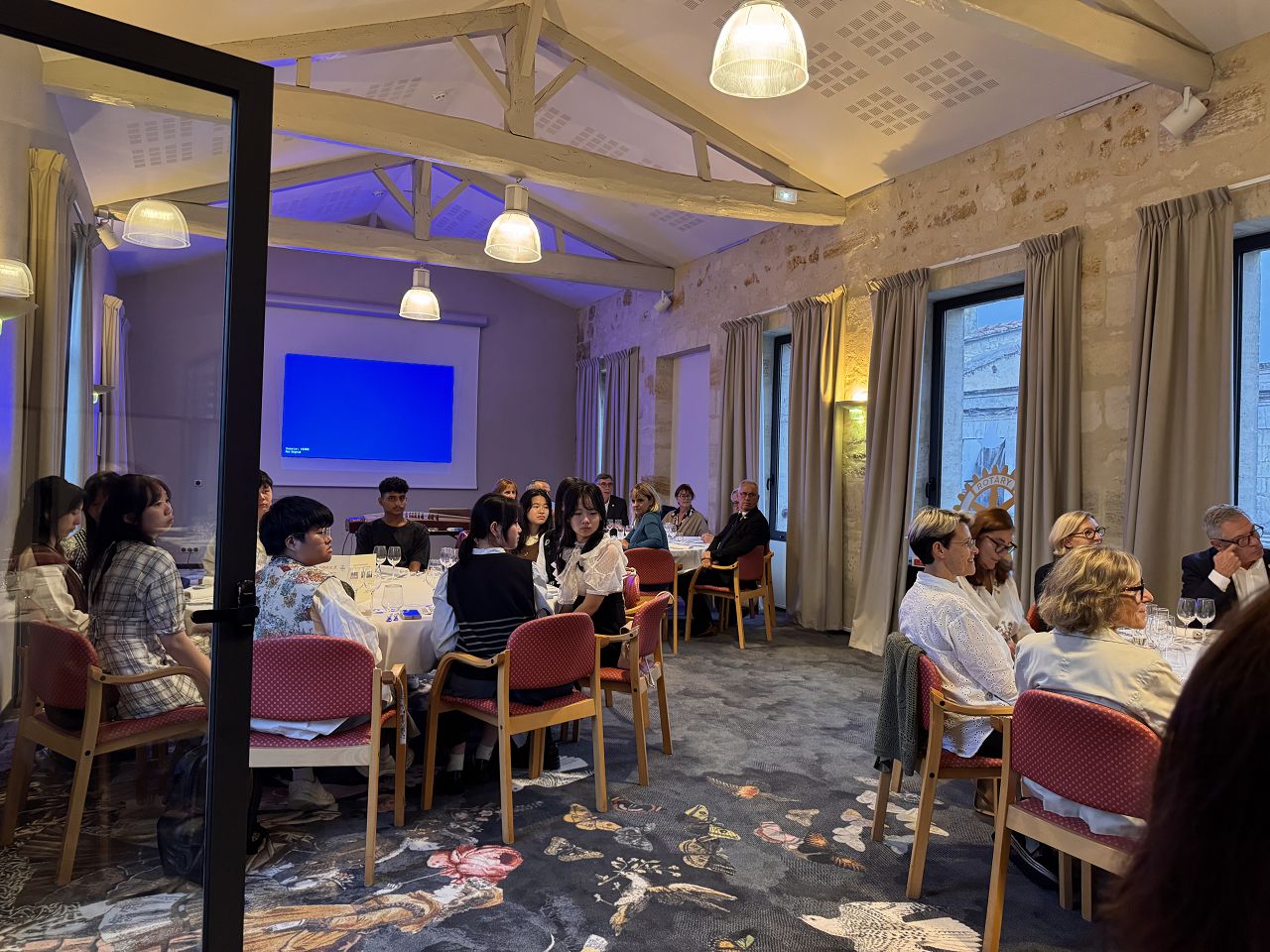 In the evening, we attended a dinner event organized by Rotary where we enjoyed delicious French food. Some of our team members played the Guzheng and sang a song. Everyone enjoyed their performances, and I felt very proud of them.