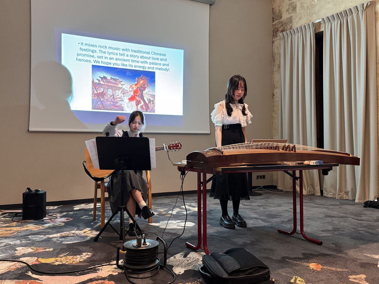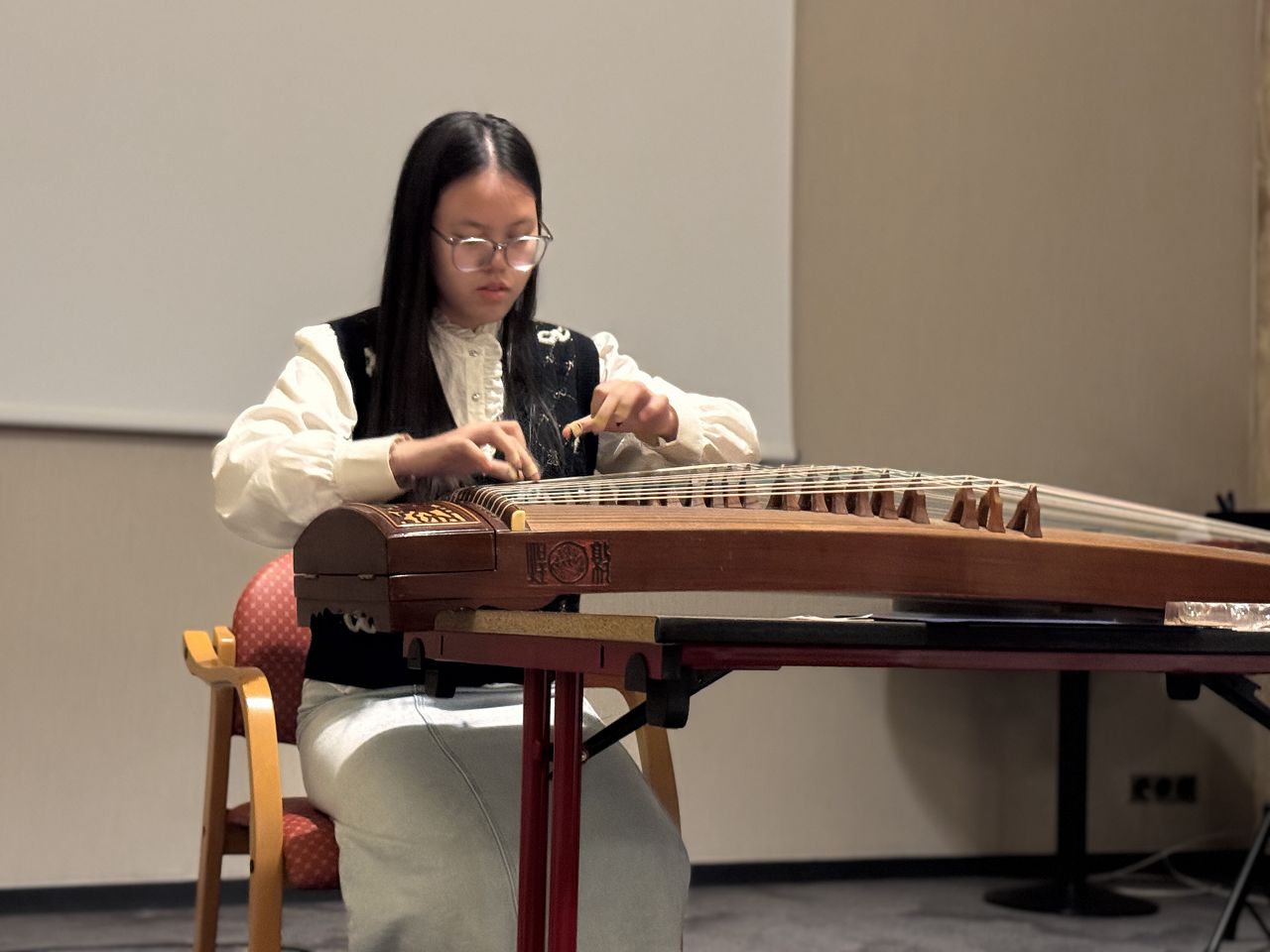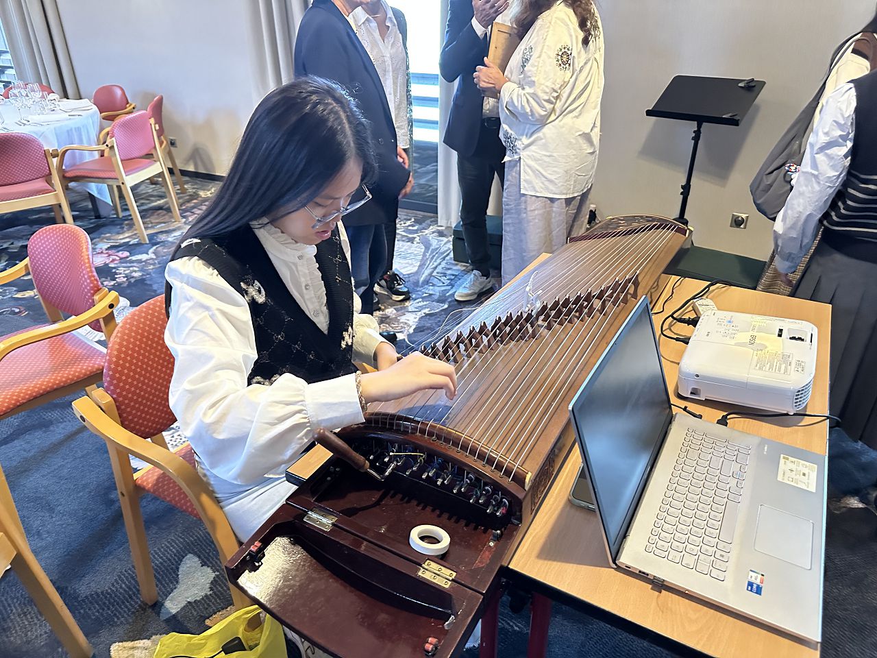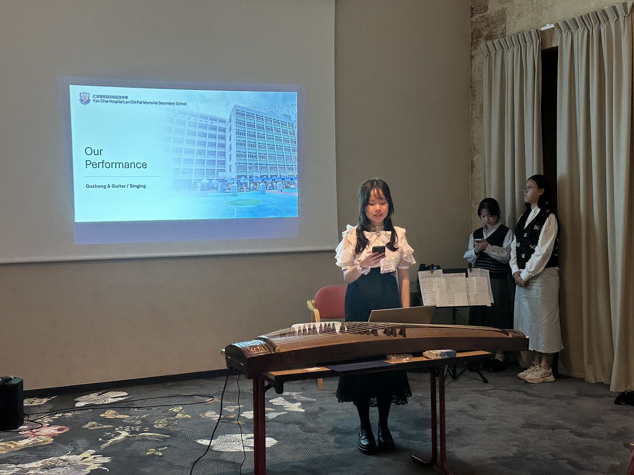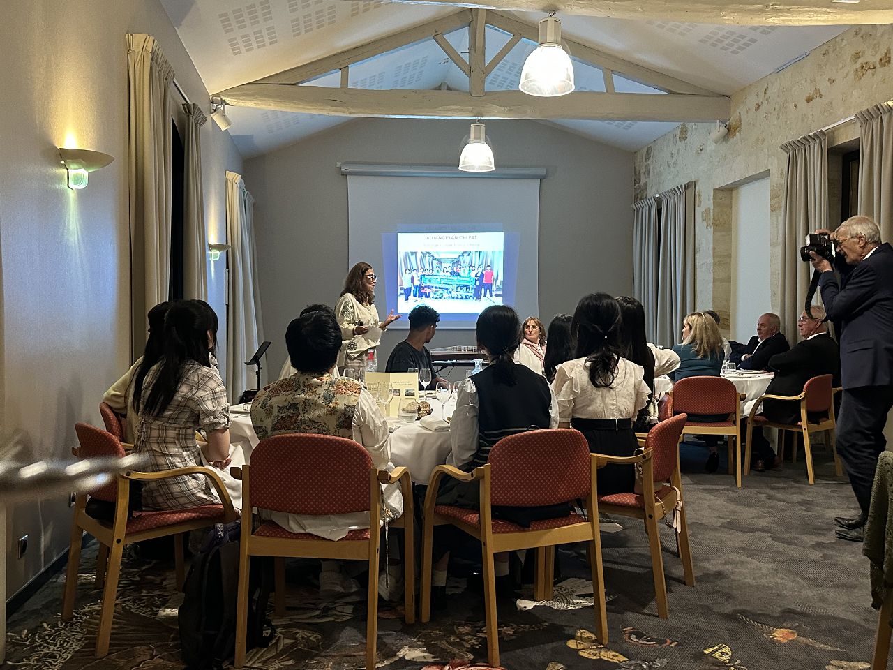 In the evening, we attended a dinner event organized by Rotary where we enjoyed delicious French food. Some of our team members played the Guzheng and sang a song. Everyone enjoyed their performances, and I felt very proud of them.