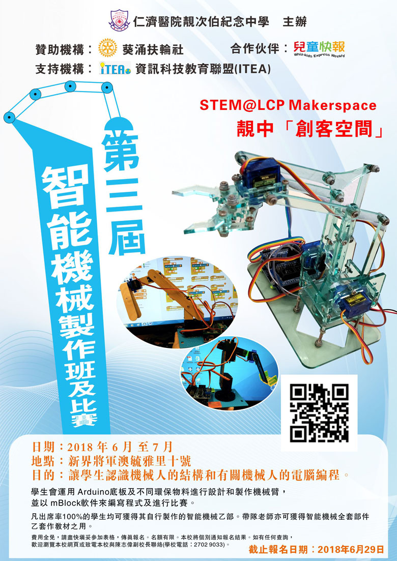 本校響應教育局提出的STEM教育課程,舉辦第三屆Android 智能機械臂比賽,讓學生體驗STEM教育課程的重點。 是次活動可讓學生認識AI機械的結構和有關AI機械的電腦編程,並以手機下載編程軟件進行比賽。 上述活動費用全免,活動於2018年7月11日圓滿結束。