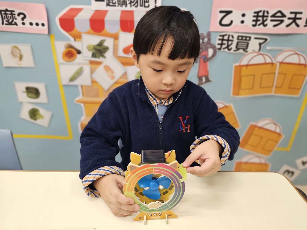 親子一同組裝太陽能小電扇,並放在陽光下,讓幼兒觀察太陽能板透過利用太陽光照射電池板產生的熱能轉換成電能,從而帶動小電扇轉動。 陽光越強,電扇就會旋轉越快。