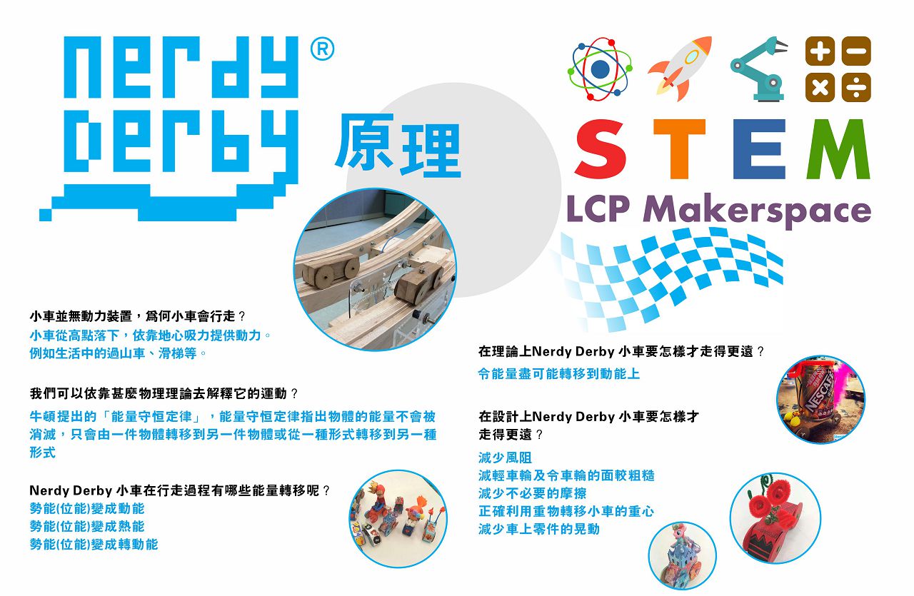 「Nerdy Derby」是一個趣味科學活動,能把透過科學、科技、工程、藝術及 數學(STEAM)概念與藝術元素結合。大會提供了一個固定的路軌, 參加者需製作一輛小車,以完成賽道,製作小車物料不限, 參加者需發揮創意去設計一架完美的小車。 詳情請參閱 https://nerdyderby.com