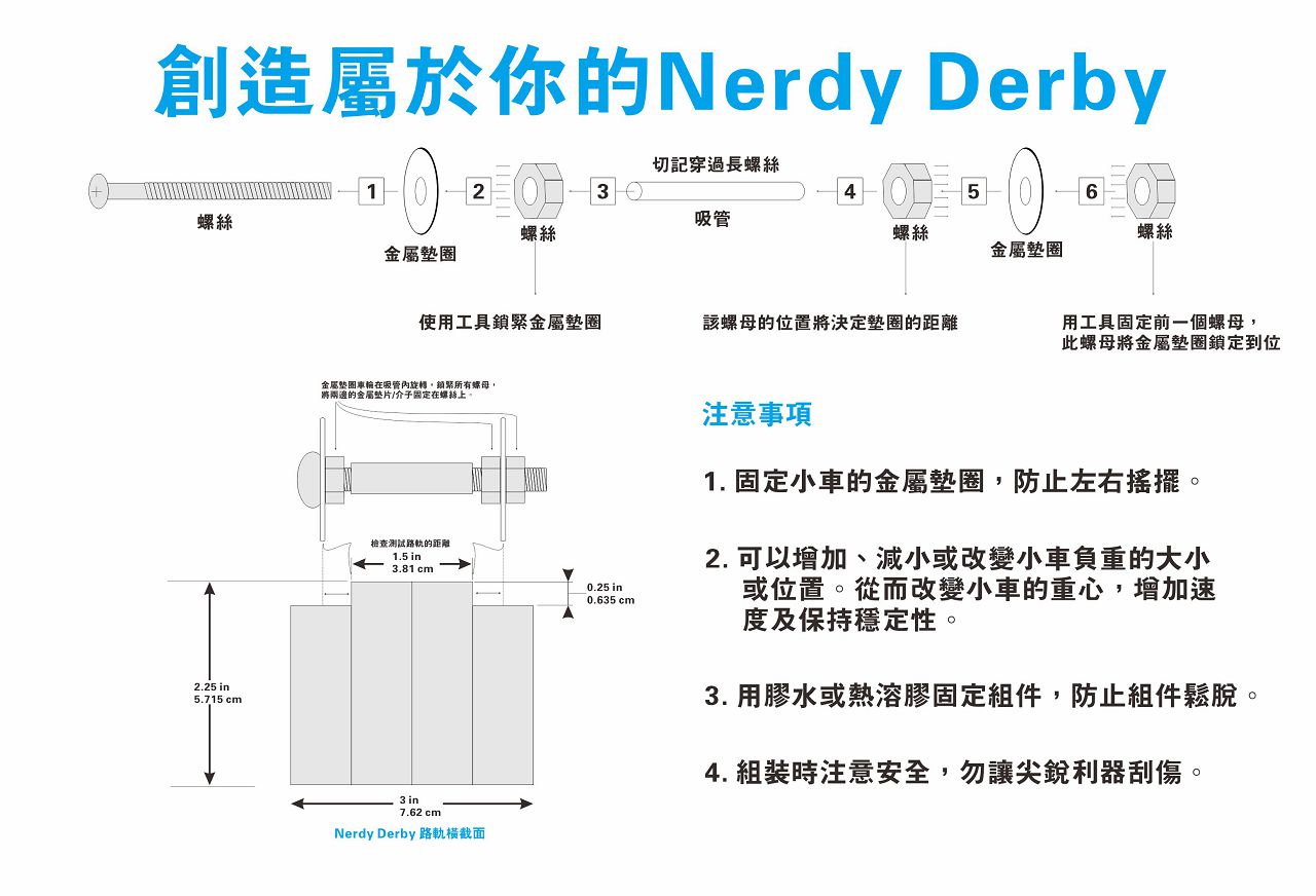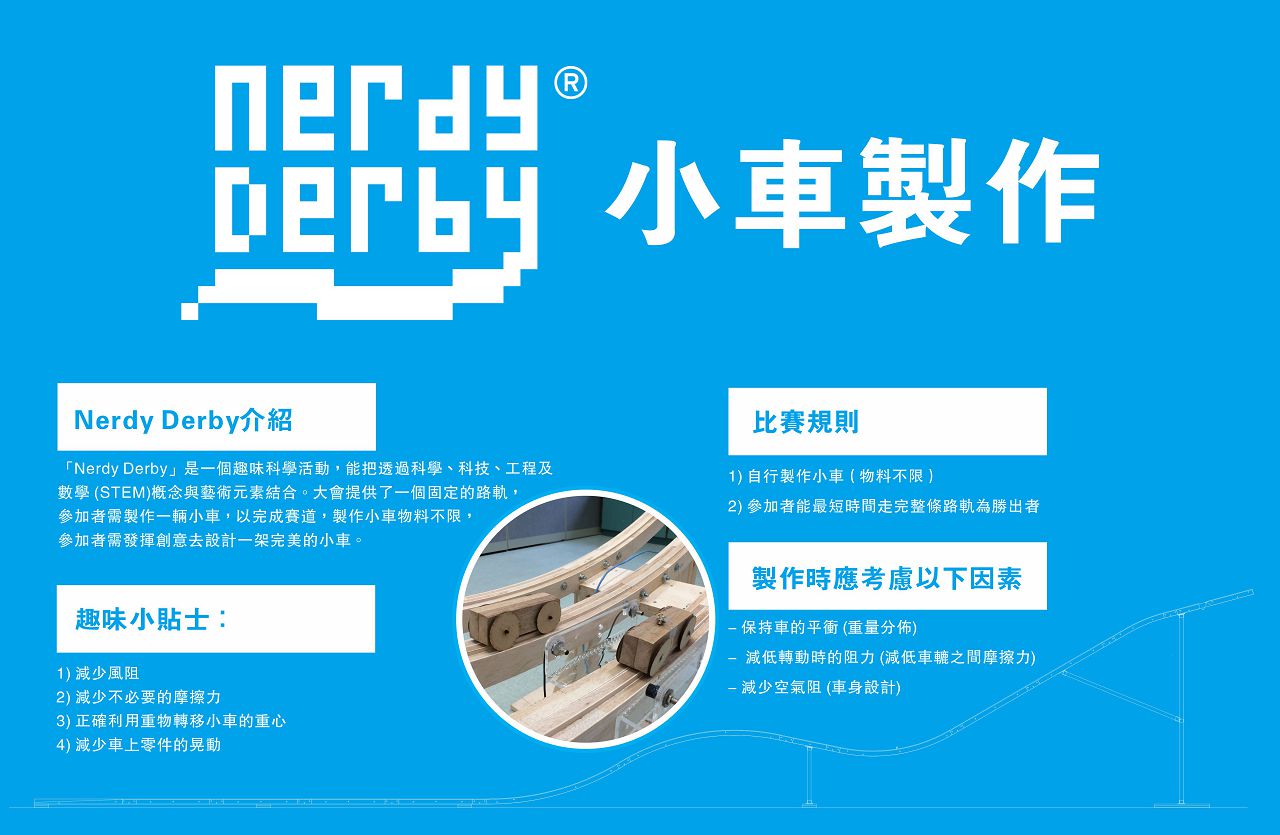 「Nerdy Derby」是一個趣味科學活動,能把透過科學、科技、工程及 數學 (STEM)概念與藝術元素結合。大會提供了一個固定的路軌, 參加者需製作一輛小車,以完成賽道,製作小車物料不限, 參加者需發揮創意去設計一架完美的小車。 詳情請參閱 https://nerdyderby.com