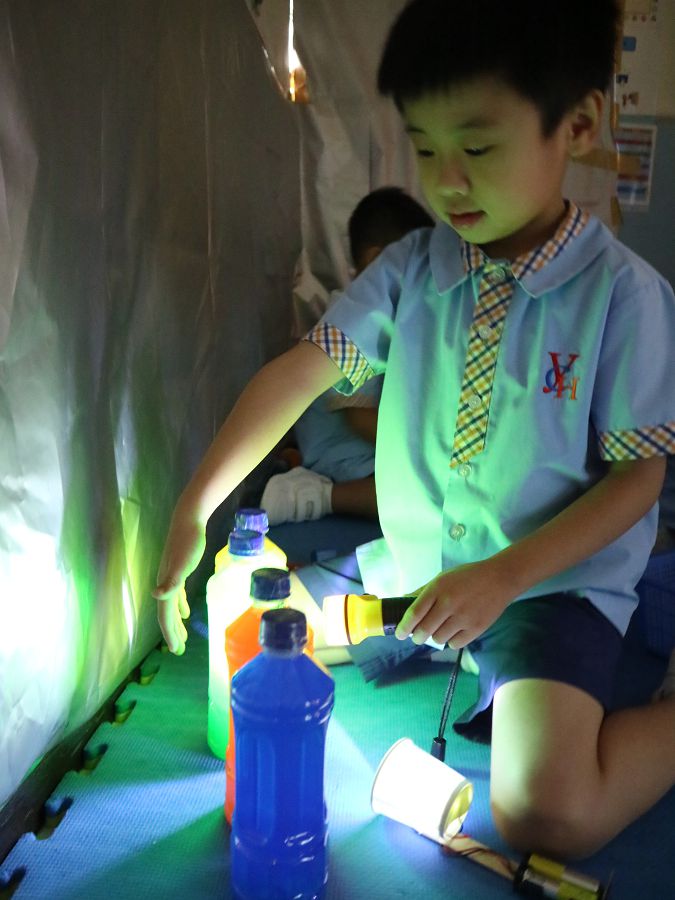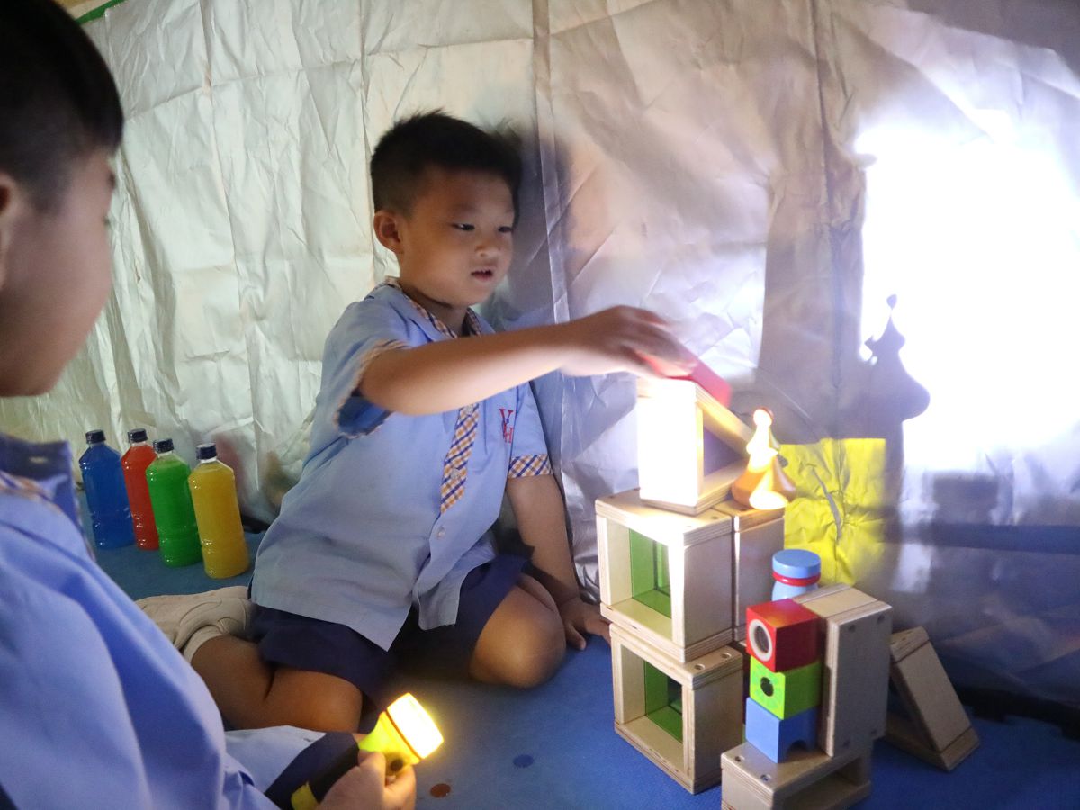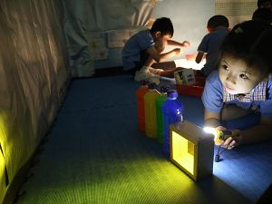 「光」是人類賴以生活的能源,一切起居活動皆需要「光」來啟動。 為探索「光」的知識隧道,我們先請參加者在創作區製作「小電筒」,親自發現「光」的力量和用途。再轉到實驗區-藉黑暗的環境,參加者又可親自發現「光」與「影」的關係(現象) ;並透過自創影子故事、沙畫、彩虹積木等活動,加深認識光、影現象的 多姿多彩!