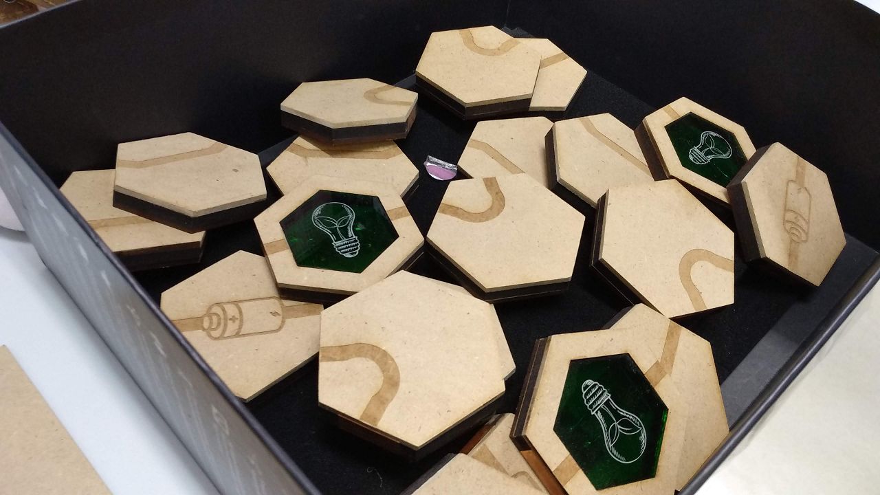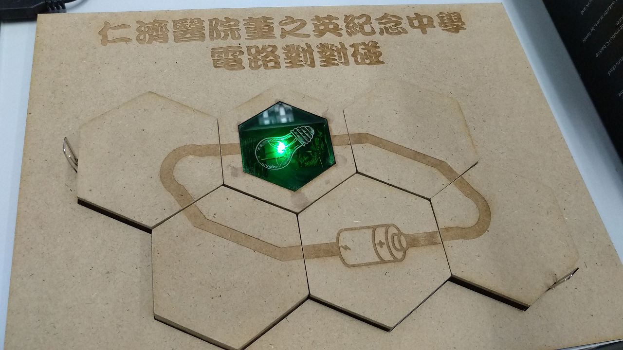 攤位遊戲提供六角模組,讓參加者在三分鐘內即場透過不斷嘗試,學習電路的特性,最後拼構出閉合電路。