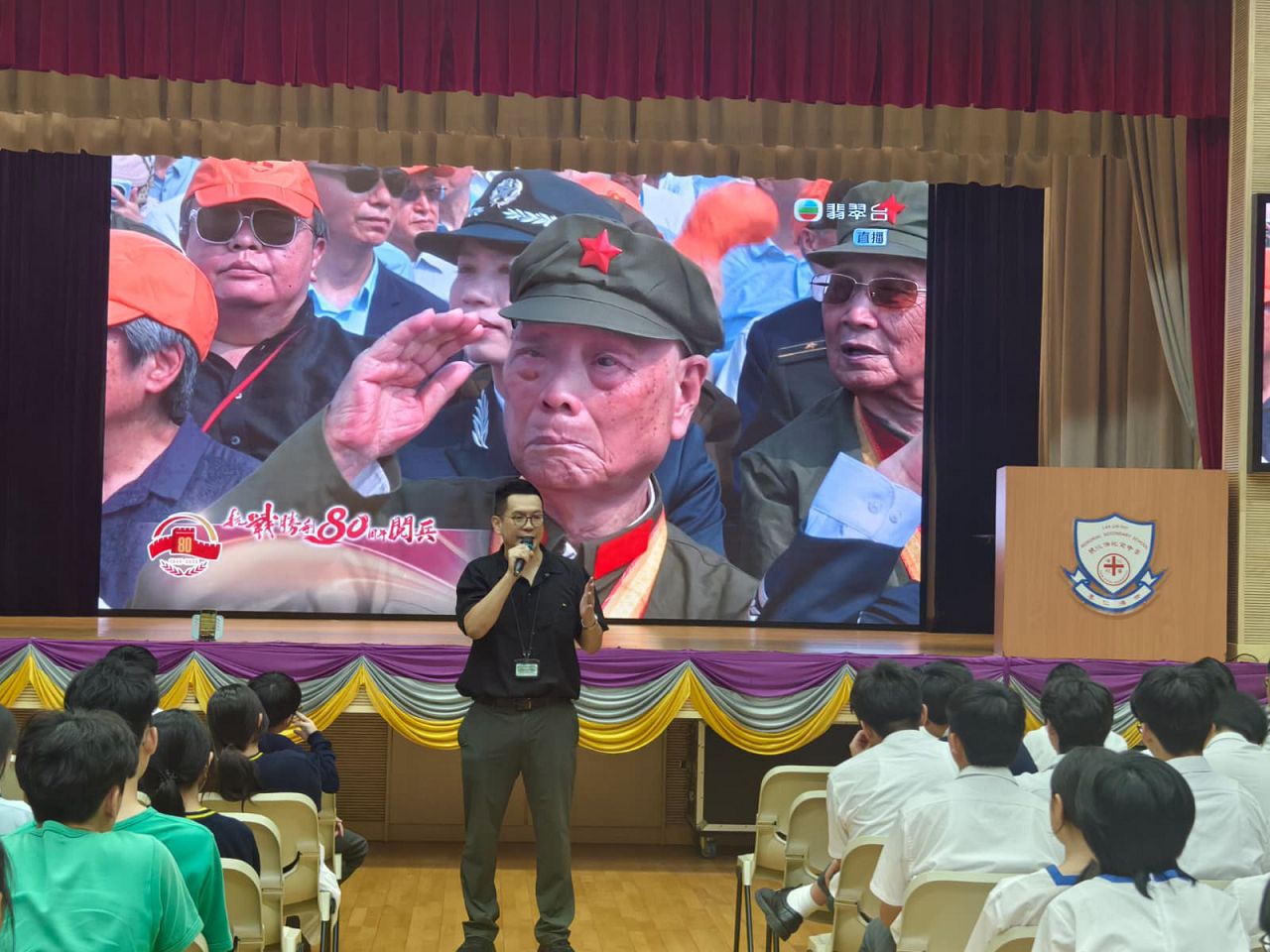 配合靚中的國情教育,歷史科主任張國文副校長在早會講述了中國人民抗日戰爭(1937-1945)的始末。這場戰爭是近代中國反抗外敵入侵持續時間最長、規模最大,且取得完全勝利的民族解放戰。1930年代,日本在中國先後製造「九一八事變」和「盧溝橋事變」,挑起侵華戰爭。中華民族上下一心奮勇抵禦入侵者,是中國近代史不能磨滅的一頁,更是第二次世界大戰同盟國在反法西斯戰爭中的重要組成部分。1945年9月2日,日本代表在無條件投降書上簽字,中、美、英等9國同盟國代表相繼簽字,接受日本投降。至此,中國抗日戰爭終於取得勝利。我們感謝許多先賢為捍衛國家犧牲性命,保衛得來不易的和平。正確理解歷史有助培育學生學生「堅毅」、「仁愛」、「團結」、「國民身份認同」、「承擔精神」等價值觀,實踐本校第二個關注事項「營造正向文化」。