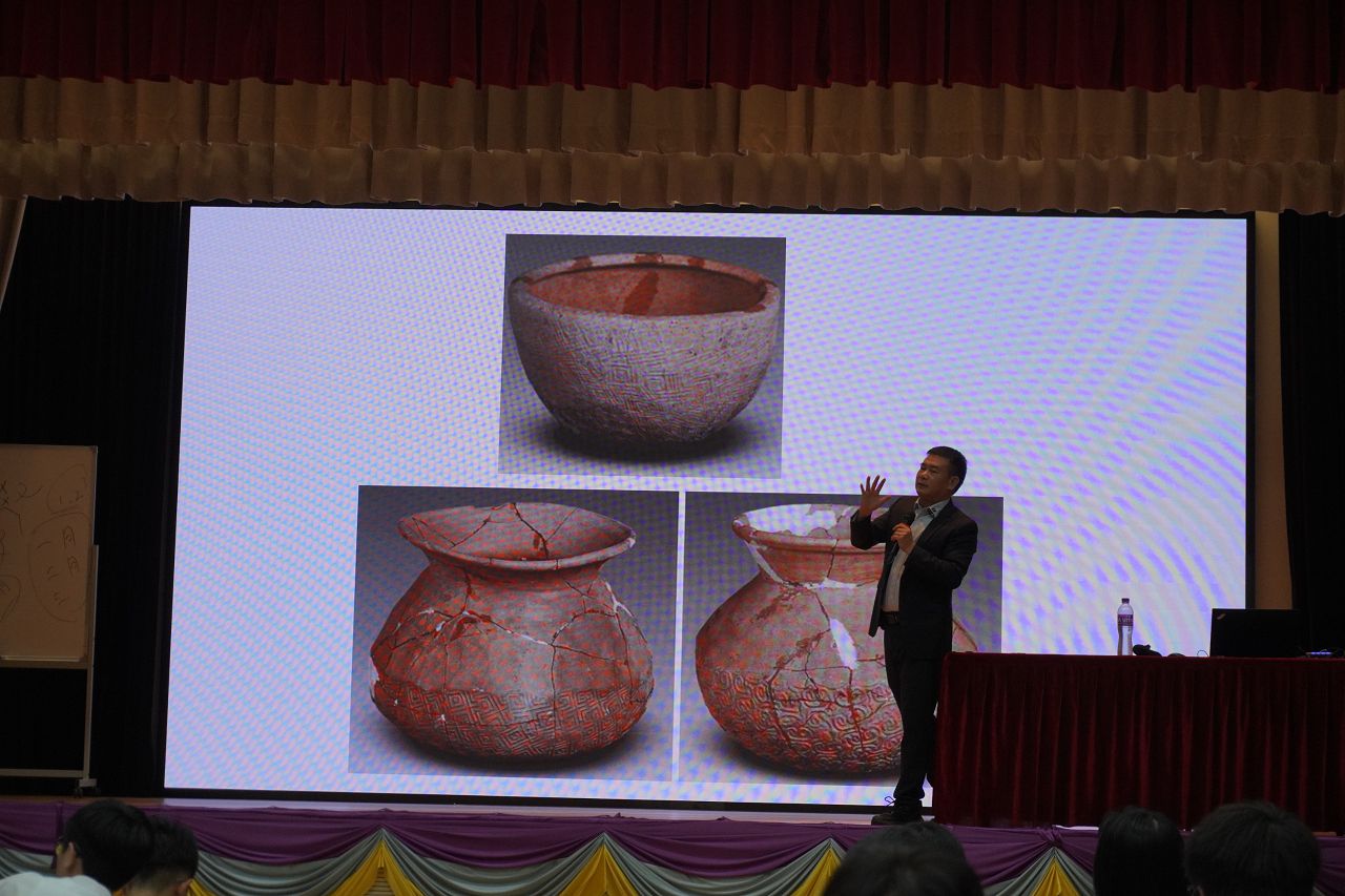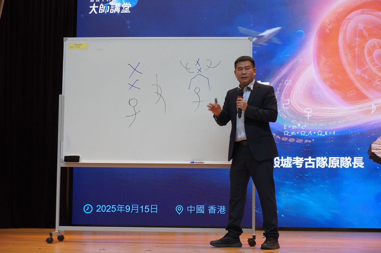 各位同學,你知道中國最早的文字是什麼嗎?從古代甲骨文中,我們能夠學到哪些有用的智慧,對現今的創科及數字教育有何關係?唐教授在講座中深入講解了甲骨文字「朝夕」與日月時間的密切關聯,指出「年」與地球公轉、「月」與月亮陰晴的自然規律,使中國曆法中設計有「第十三個月」,以調節年與月之間的差異。這展示了漢字不僅是中華民族象形、會意、形聲等造字文化的結晶,更蘊含古人觀察星象、探索自然科學的創新精神。而甲骨文「教學」兩字更是代表了夏商年代十進制數字教育的例子。此外,廣東省出土的陶瓷文物上刻有「雷」與「雲」甲骨文字的圖案,顯示中港地區屬於同一文化圈,關係密不可分。